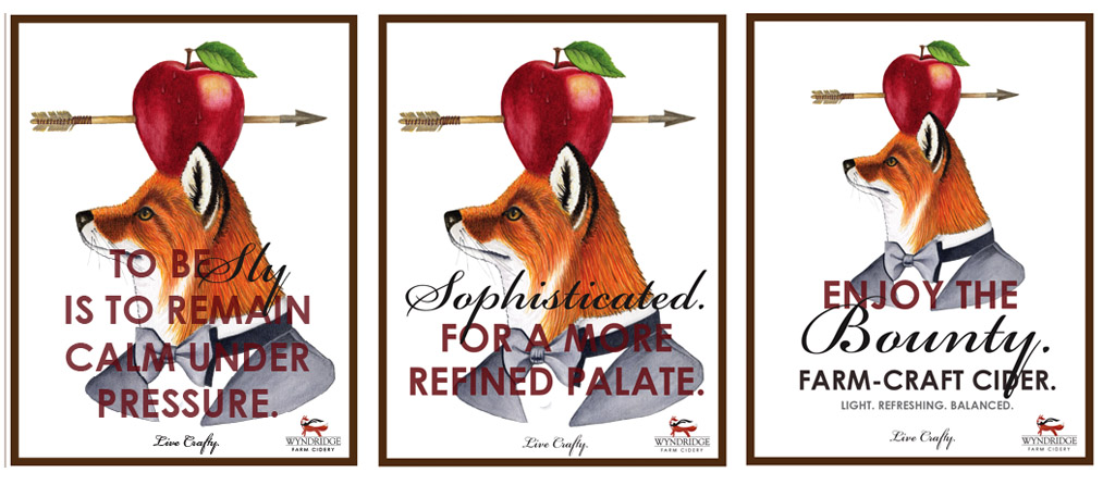 The main brand goal was to change the perception of hard ciders. Currently, most hard ciders add extra sweeteners (pure apple concentrate) into their mix, creating a candy-like drink. Wyndridge Farm Cider uses pressed apples and yeast, creating a lighter/more refreshing cider. Because of this, instead of “Hard Cider,” we called it “Crafty Cider.” Also, the brand needed to say elegance, but in a fun way. So, we portrayed the Wyndridge Fox as a tuxedo-wearing William Tell.