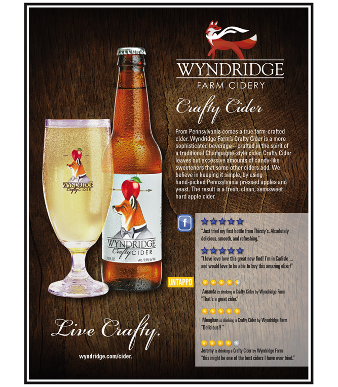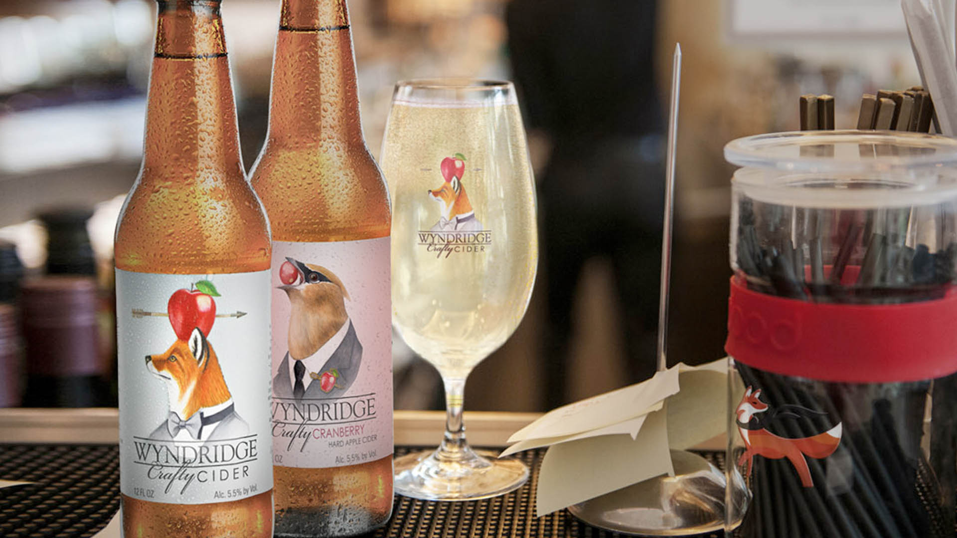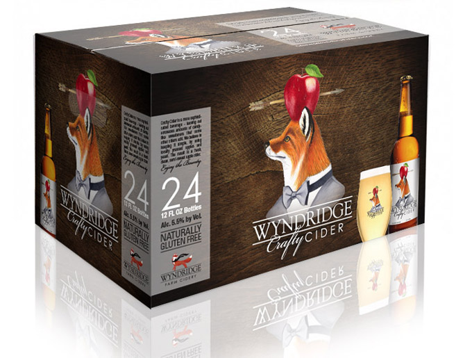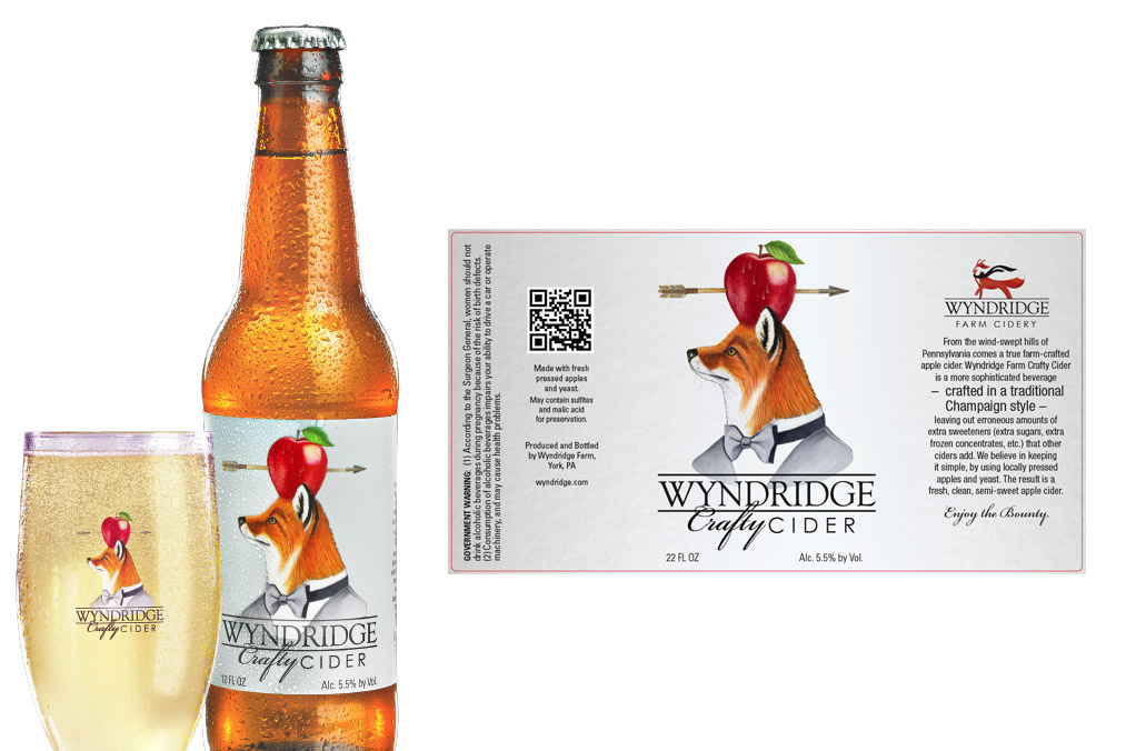 The main brand goal was to change the perception of hard ciders. Currently, most hard ciders add extra sweeteners (pure apple concentrate) into their mix, creating a candy-like drink. Wyndridge Farm Cider uses pressed apples and yeast, creating a lighter/more refreshing cider. Because of this, instead of “Hard Cider,” we called it “Crafty Cider.” Also, the brand needed to say elegance, but in a fun way. So, we portrayed the Wyndridge Fox as a tuxedo-wearing William Tell.